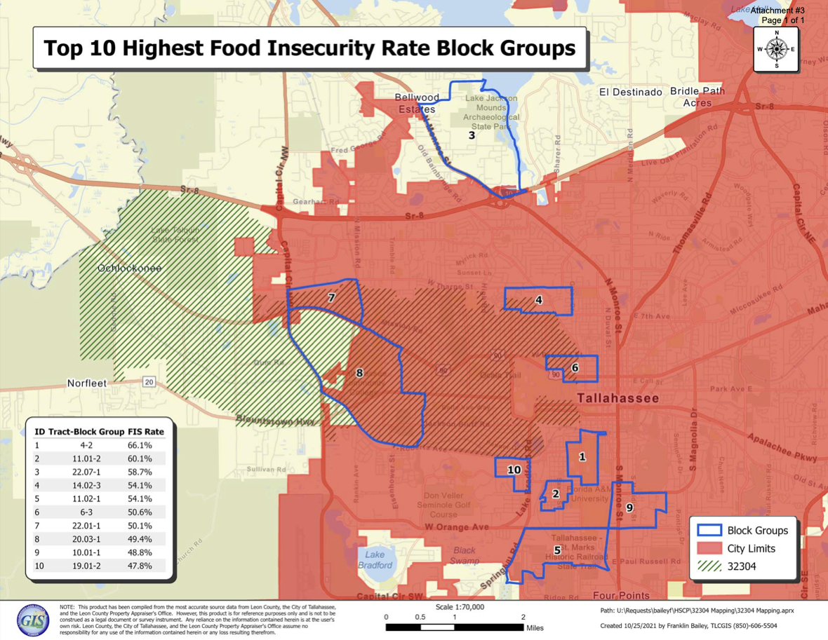 The FAMU area has the highest rate of food insecurity in Leon County. Almost 66.1% of residents lack the means, at times, to acquire food for themselves or other household members due to insufficient funds and other resources. Nearly 15% of Leon County residents are food insecure, according to a 2021 study by Feeding America.